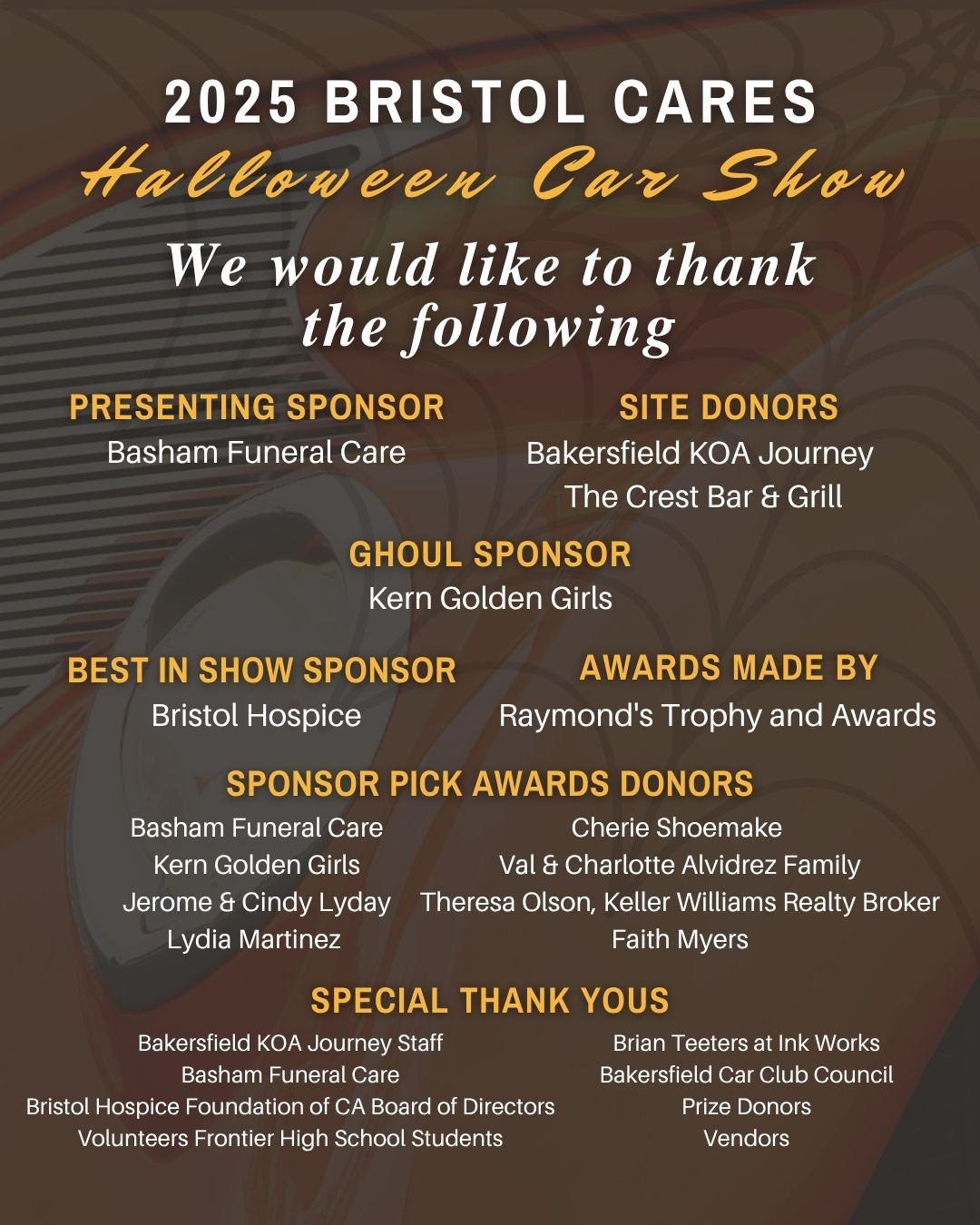 Our 2025 Bristol Cares Halloween Car Show held at the KOA RV Resort/Crest Bar & Grill (formerly Bakersfield RV Resort) was a huge success. Thank you to everyone who participated in the show and supported the Mission of the Foundation.